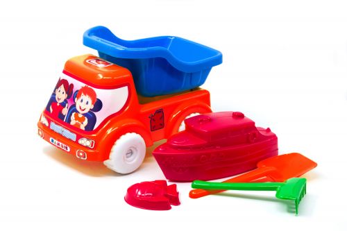 Машинка самоскид № 3. У комплекті з пластиковим самоскидом йде: лопатка, граблі, пасочка і кораблик.