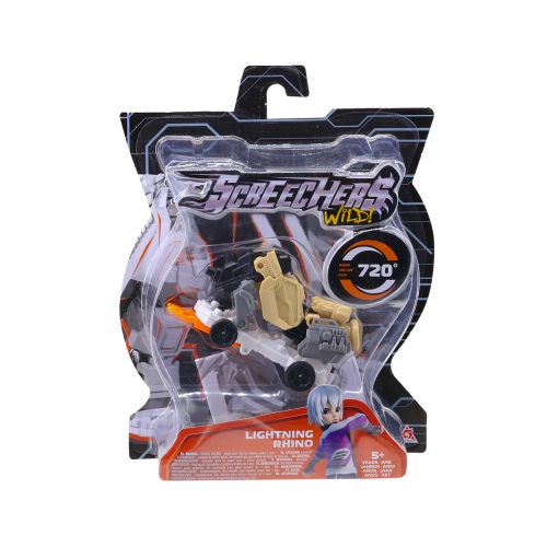 Screechers Wild – це перші іграшки-машинки, які роблять сальто та трансформуються у фантастичну істоту прямо у повітрі. Скрічер Лайтнінг Райно робить перекид на 720° та трансформується в містичного носорога навіть без диска. Для того, щоб трансформувати героя назад у машинку, потрібно обережно притиснути всі деталі та закріпити. У комплекті є машинка-трансформер та колекційна картка. Для дітей від 5 років.
