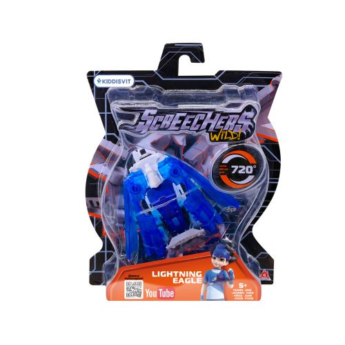 Screechers Wild – це перші іграшки-машинки, які роблять сальто та трансформуються у фантастичну істоту прямо у повітрі. Скрічер Лайтнінг Ігл робить перекид на 720° та трансформується в містичного орла навіть без диска. Для того, щоб трансформувати героя назад у машинку, потрібно обережно притиснути всі деталі та закріпити. У комплекті є машинка-трансформер та колекційна картка. Для дітей від 5 років.