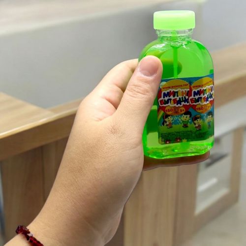 Мильні бульбашки “Веселкові бульбашки”. Спосіб використання: витягти рамку з флакона, піднести до рота на 10-15 см і повільно подути. Гра з бульбашками розвиваэ фантазію, а ловлячи бульбашки ще й координацію рухів. Продаеться у гарній пластиковій баночці на 150 г.