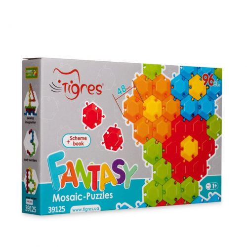 Мозаїка-пазли “Фантазія” складаються з 96 елементів п’яти кольорів, які можна поєднувати між собою. Такі ігри розвивають фантазію, дрібну моторику рук та логічне мислення, допоможуть малюкові вивчити кольори. Розмір деталі – 4,8 см. Книга зі схемами в комплекті.