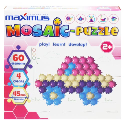 Мозаїка пазл складається з 60 яскравих пластикових деталей 4 кольорів, які можна з’єднувати між собою. Розмір однієї деталі: 45 мм. Також у наборі є книжечка-підказка. Гра з мозаїкою розвиває мислення, уяву та дрібну моторику. Набір виконаний із якісних та безпечних матеріалів. У комплекті великі деталі, які підходять для дітей від 2-х років.