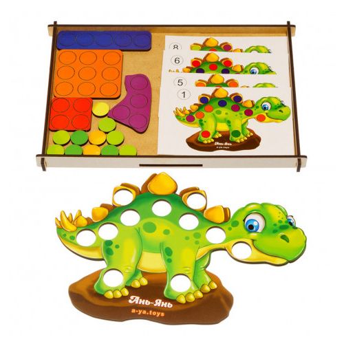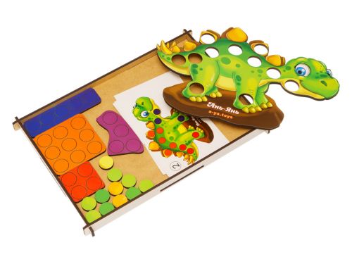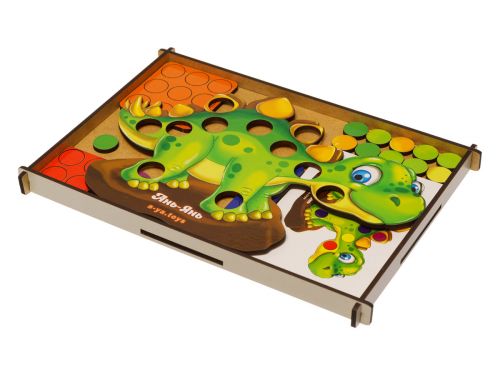 Розвиваюча гра мозаїка. У наборі є фігурка динозавра, у якого знімні деталі у вигляді кругів. Також є картки із завданнями, в яких потрібно правильно розставити кольори. Гра допоможе розвивати логіку, посидючість, колірне сприйняття.
