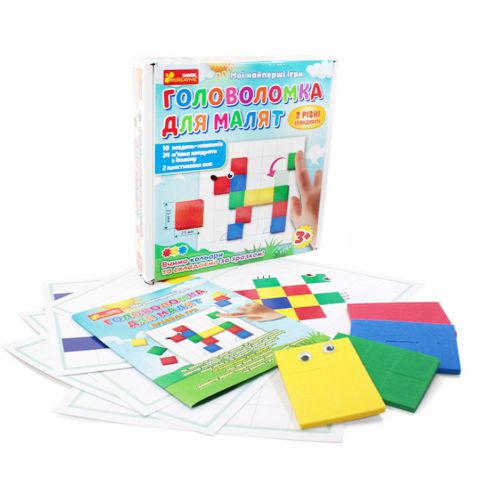 Під час гри дитина із задоволенням викладає приємні на дотик квадратики на яскравий малюнок, називаючи кольори. Щоб малюнок ніби ожив – просто додайте до нього очі. Озвучуйте тварин разом із малюком. У наборі багато картинок. Комплектація гри: 10 завдань малюнків, 24 м’які різнокольорові квадратики, лист-основа, правила, пара пластикових очей. Для дітей віком від 3-х років.