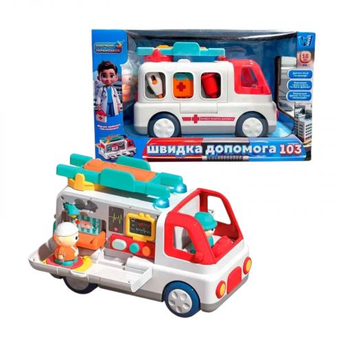 Музична машинка ОЗВУЧУВАННЯ УКРАЇНСЬКОЮ МОВОЮ, “Швидка допомога”, пісні, цікаві факти, віршики, підсвічування, сирена, 2 фігурки: пацієнт та лікар, 2 режими гучності, рухомі елементи, в коробці