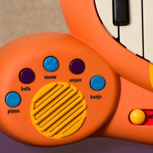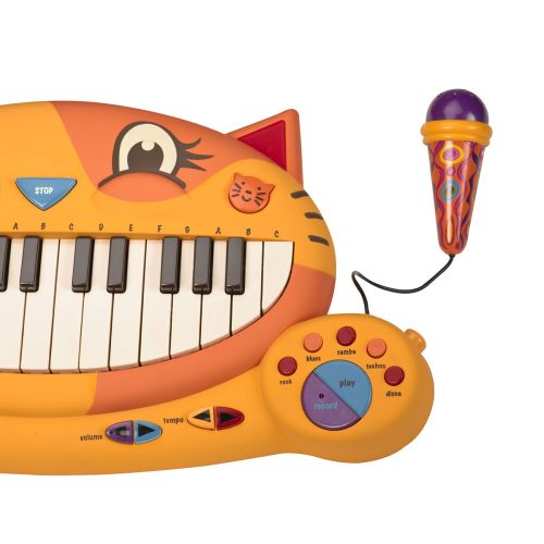 Музична іграшка “Котофон”. Яскрава музична іграшка, що обовʼязково сподобається малюку. Є можливість відтворювати звуки 5 інструментів: банджо, орган, дзвіночки, фортепіано. Також, Котофон має 5 ритмів: рок, блюз, самба, техно, диско, 20 мелодій і 7 кумедних пісеньок. Є вбудований мікрофон зі шнуром, що втягується. Гучність і темп регулюються. Іграшка має функцію запису та відтворення. Розмір іграшки: 50х6,5х26 см.