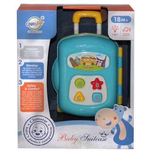 Інтерактивна музична іграшка у вигляді валізи на колесах із 4 кнопками. Ручка висувна. Оснащена звуковими ефектами (кумедні звуки та мелодії). Зі світлом. Розмір – 10 х 5 х 14 см.