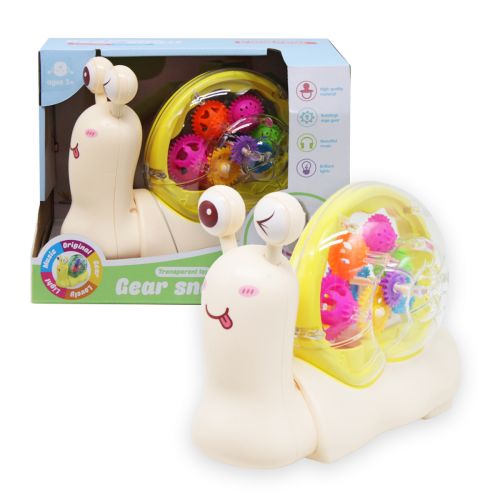 Оригінальна музична іграшка у вигляді равлика з прозорою черепашкою. Усередині мушлі видно механізми – різнокольорові шестерні, які обертаються при включенні. Равлик їздить у довільних напрямках, грає веселу мелодію під час їзди. Має яскраве різнокольорове підсвічування. Розмір іграшки: 14х19х7 см.