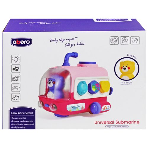 Музична іграшка-сортер “Субмарина” із боцманом у вигляді чарівного ведмедика. З боків підводного човна розташовані віконця різних форм, у які дитина зможе вставляти відповідні фігурки. Кожна фігурка в наборі наповнена маленькими кульками, які видають звук, що нагадує брязкальце. При включенні у субмарини починають світитись фари, іграшка відтворює дитячі мелодії. Довгим натисканням на кнопку включення можна включити режим їзди: субмарина їздитиме у довільних напрямках. У наборі є шнурок, який можна прикріпити до іграшки і возити її за собою. Розмір іграшки у зібраному вигляді: 20х27х12 см.