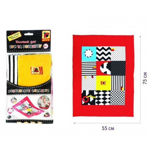М’яка розвиваюча іграшка “Килимок” буде цікавим подарунком малюкові. Підходить для дітей з перших днів життя. Верхній шар килимка – 100% бавовна, нижній шар – синтетична тканина, наповнювач – ізолон, холлофайбер. На килимку є різні нашивки. Розмір килимка – 69х51 см. Виконано з якісних і безпечних матеріалів.