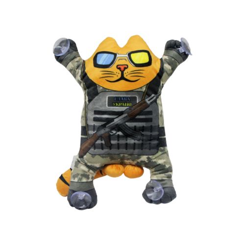 Іграшка відмінно підійде як подарунок чи прикраса в машину. Має присоски на лапках. Котик із написом “Слава Україні” на бронежилеті. Розмір іграшки 28х15х7 см.