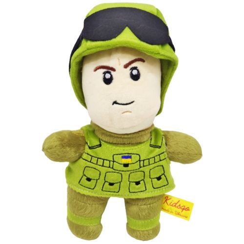 М’яка іграшка у вигляді солдата в бронежилеті та касці із захисними окулярами. Бронежилет знімається, окуляри можна спустити на очі. Виконаний з якісних матеріалів, приємний на дотик. Виготовлено в Україні. Висота: 24 см.