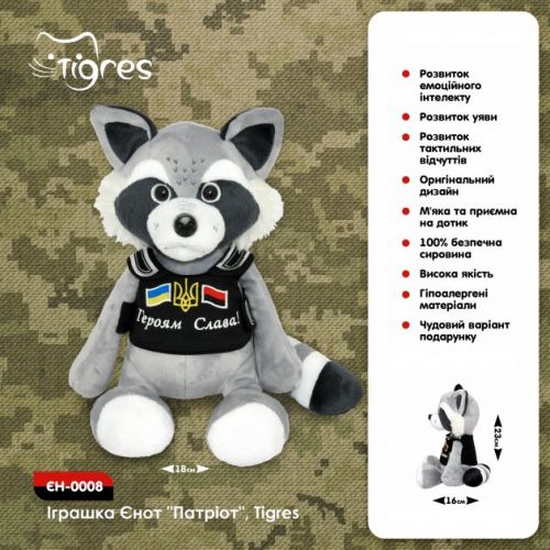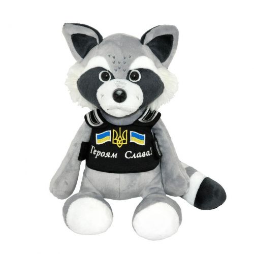 Мила м`яка іграшка у вигляді єнотика у бронежилеті з написом “Героям слава!”. Бронежилет на липучках – можна зняти. Іграшка виконана з м`якої, міцної та дуже приємної на дотик тканини. Набита синтепоном. Розмір іграшки – 40х20х10 см. Виготовлено в Україні.