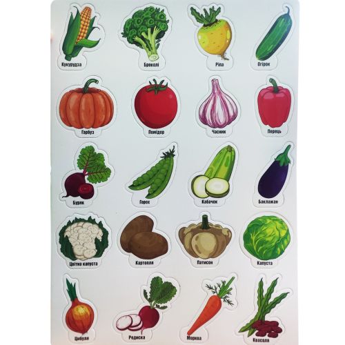 Набір з 20 магнітів з овочами на листі розміром 39х30 см. Кожен овоч підписаний українською мовою. Граючи з такими магнітами дитина зможе весело та легко вивчити назви продуктів харчування. Виконані з якісного та безпечного матеріалу. Для дітей віком від 3-х років.
