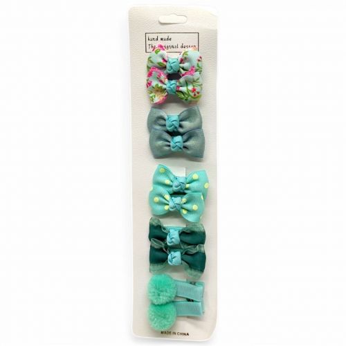 Набір милих прикрас для волосся (заколочок) у вигляді бантиків. Такі бантики чудово доповнять образ юної принцеси. Кожна заколочка має металевий каркас та текстильну обшивку. Тип кріплення: “крокодильчик”. У комплекті є 5 пар бантиків. Розміщені на картонному аркуші.