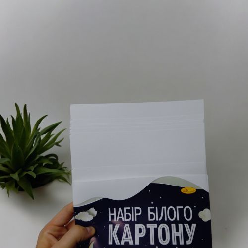 Набір білого одностороннього картону від бренду Апельсин. У комплекті 7 аркушів формату А4. Цупкий та якісний. Використовується для творчих робіт у школі та вдома. Запакований у тонку паперову обкладинку. Відповідає санітарно-гігієнічним нормам України.