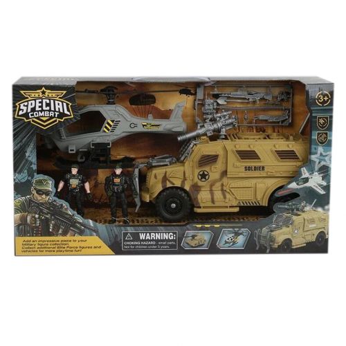 Набір військової техніки. В комплект входять бронетранспортер із деякими рухомими елементами, вертоліт, 2 фігурки солдатів, зброя. За допомогою набору можна побудувати військову сцену чи просто весело грати. Все зроблено із високоякісного пластику.