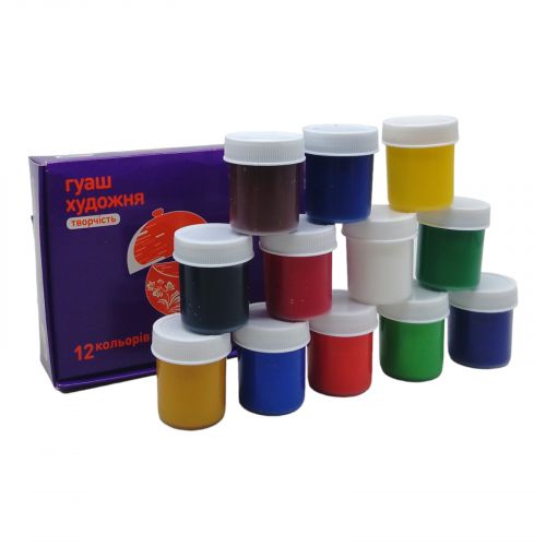 Набір гуаші на 12 кольорів. Стійка, яскрава та без запаху. Кожна баночка містить 40 мл фарби, забезпечуючи безліч можливостей для експериментів та творчості. Набір ідеально підходить для використання в домашніх умовах, у школі або на заняттях у гуртках. Фарби якісні та безпечні для дітей. У набір також входить пензлик для малювання.