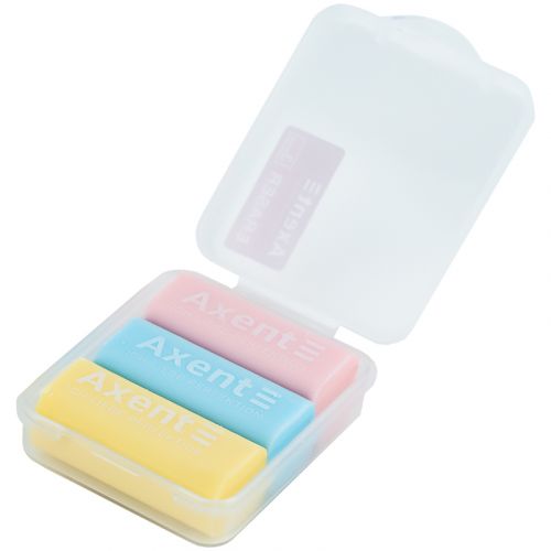 Набір гумок Axent Pastelini 1198-A з термопластичної гуми, що не пошкоджує папір під час стирання олівця. Гумки гнучкі, пластичні та не кришаться, асорті кольорів (3 штуки) у пластиковому боксі. Упаковка: картонний дисплей.