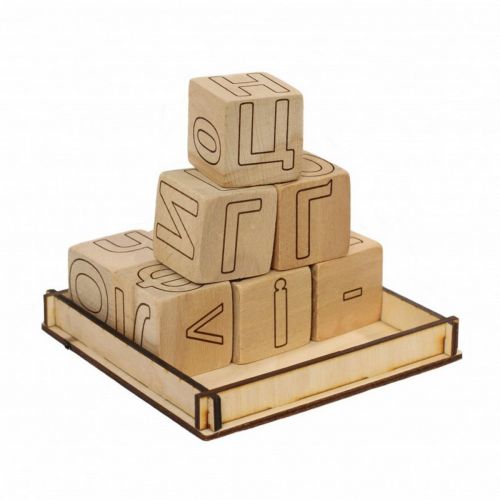 Набір з 9-ти дерев’яних кубиків із зображеннями цифр та букв українського алфавіту. Розмір одного кубика – 4х4х4 см. Набір повністю виконаний з дерева.