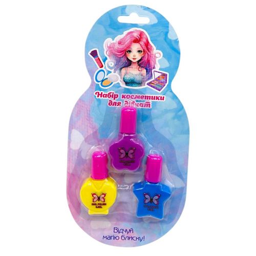 Набір дитячої косметики “Fashion girl” .В наборі є 3 лаку для нігтів різного кольору. Виконаний з якісних і безпечних матеріалів. Для дітей від 8 років.