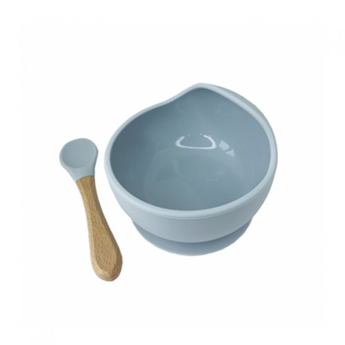 Набір для годування дитини. У комплекті є: силіконова мисочка і ложечка з дерев’яною ручкою. У мисочки є присоска і бортик (з одного боку), який перешкоджає проливанню їжі. Довжина ложечки – 14 см. Виконано з якісних і безпечних матеріалів.