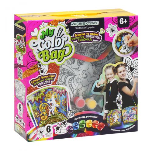 Набір для креативної творчості “My Color Bag”. Яскраво розписане сіюящая сумочка з плетеними ручками і вшитой блискавкою. Розфарбуй фарбами і прикрась глітером сумочку за власним дизайном.