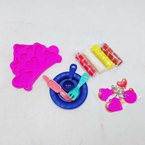 Комплектація: 4 стику з тістом, форма для ліплення, ніж, ложка, вилка, тарілка, 3 основи для брелоків, 3 ланцюжки, наліпки