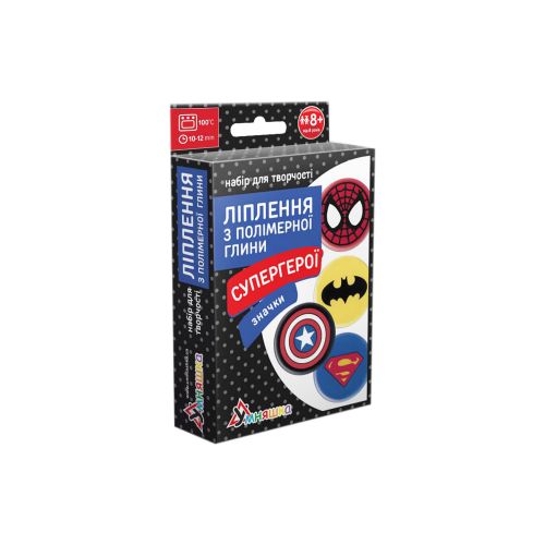 Набір для ліплення з полімерної глини. Полімерна глина – це спеціально створений матеріал, який ліпиться як пластилін, але при цьому твердне в духовці при дуже високих температурах (100 ° C на 10-12 хвилин). Створи значки з символікою супергероїв своїми руками.