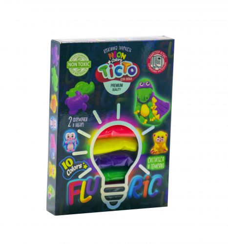 Тісто “Fluoric” – це набір креативної творчості, унікальність якого полягає в складі матеріалу і його дивну здатність – світиться в темряві. 10 кольорів тесту (по 15 г), 2 формочки і стек в наборі