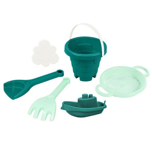 Комплектація: Відерце, лопатка, граблі, ситечко, формочка для піску та кораблик