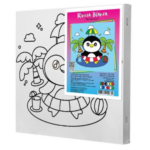 Комплектація: синтетичне полотно з нанесеними контурами майбутнього малюнка, натягнуте на дерев’яну рамку; водорозчинні акрилові фарби; пензлик