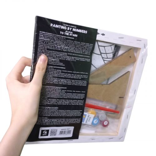 Комплектація: полотно на підрамнику з галерейною натяжкою, художні нейлонові пензлі, палітра акрилових фарб у контейнерах, дерев’яні деталі підставки для картини.