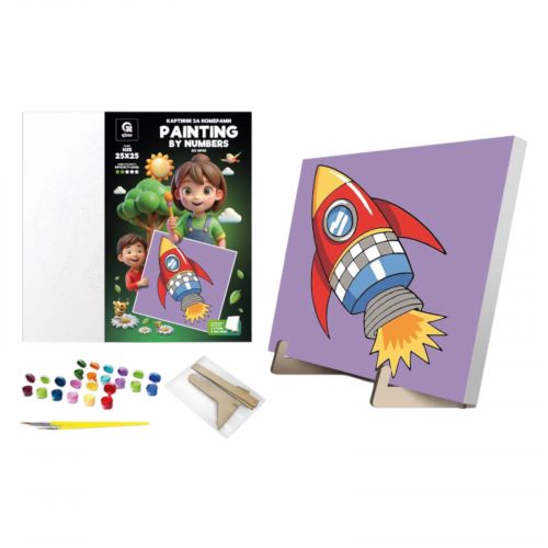 Дитяча картина за номерами. Для того, щоб намалювати картину, необхідно малювати за пронумерованими контурами, які відповідають кольору фарби. У наборі: полотно на підрамнику з галерейною натяжкою, художні нейлонові пензлі, палітра акрилових фарб у контейнерах, деревʼяні деталі підставки для картини. Усі необхідні фарби вже в комплекті та не вимагають змішування. Розмір: 25х25 см. Рекомендовано для дітей старше 5 років.