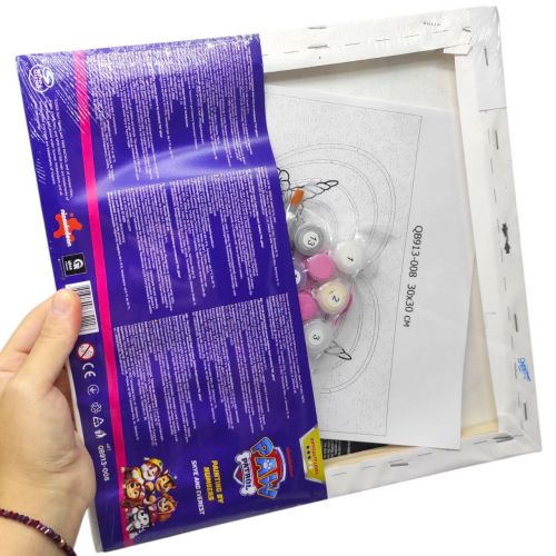 Комплектація: полотно на підрамнику з галерейною натяжкою, художні нейлонові пензлі, палітра акрилових фарб у контейнерах, дерев’яні деталі підставки для картини.