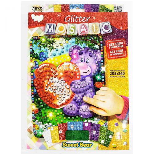 Дитячий набір для творчості “Блискуча мозаїка”. Метод створення картин за номерами дуже простий і доставить масу задоволення. Зазначені на схемі кольору рекомендовані для отримання результату, зображеного на упаковці. Картину, так само, можна прикрасити гліттернимі наклейками на свій розсуд. Розмір картинки: 20,5х26 см.