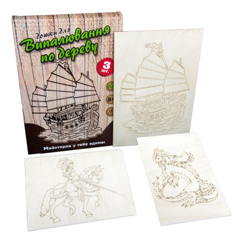 Набір для творчості “Випалювання по дереву”. У комплекті: 3 дошки для випалювання та інструкція. Розміри дощок: 14,8 х 21 см (2 шт) і 29,7 х 21 см. Випалювач в комплект не входить. Набір виготовлений з екологічних і безпечних матеріалів. Для дітей від 8-ми років.