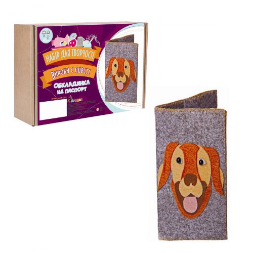 Набір для творчості “Вироби з фетру: обкладинка на паспорт”. За допомогою цього набору можна створити м’яку і оригінальну обкладинку на паспорт із зображенням собачки. У комплекті є всі необхідні для цього матеріали.