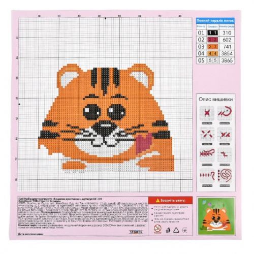 Набір для творчості вишивка хрестиком розміром 20х20 см. Чудовий вибір для подарунка чи нового хобі. Вишивати треба тільки центральні частини, не чіпаючи фон. І в результаті ви отримаєте готову картину з обʼємним малюнком, ніби 3D ефект. У комплект входить набір ниток і пластикова голка, що забезпечить безпечний процес вишивання для дітей. Кількість кольорів – 5. Рекомендовано для дітей старше 7 років.