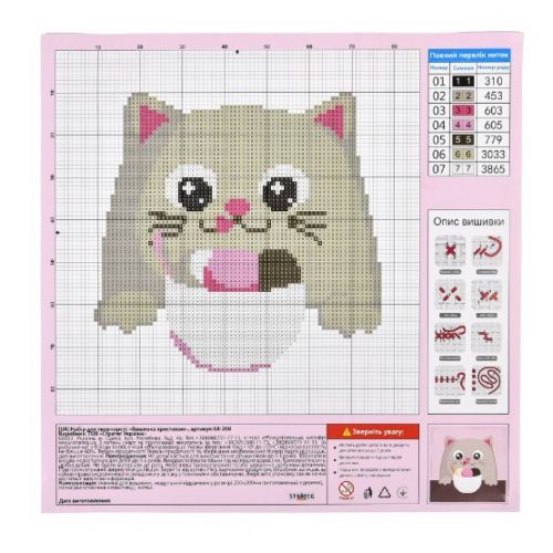 Набір для творчості вишивка хрестиком розміром 20х20 см. Чудовий вибір для подарунка чи нового хобі. Вишивати треба тільки центральні частини, не чіпаючи фон. І в результаті ви отримаєте готову картину з обʼємним малюнком, ніби 3D ефект. У комплект входить набір ниток і пластикова голка, що забезпечить безпечний процес вишивання для дітей. Кількість кольорів – 7. Рекомендовано для дітей старше 7 років.