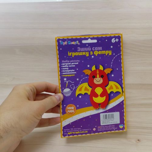 Набір для творчості від українського бренду “Аплі Краплі”. З допомогою деталей набору можна самостійно створити невеличку мʼяку іграшку з фетру. У комплекті є все необхідне: фетрові деталі, набір ниток, голка, інструкція (на упаковці), синтетичний наповнювач. Даний вид творчості чудово допоможе розвинути у дитини креативність, посидючість, увагу, дрібну моторику рук. Виготовлено з якісних та безпечних матеріалів. Рекомендовано для дітей старше 6 років.