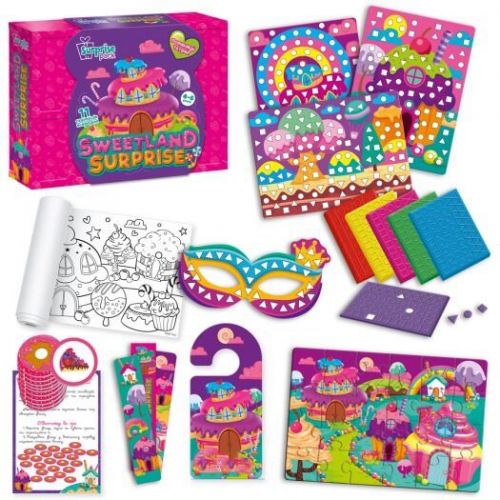 Комплектація: 2 прикраси для волосся, 12 листів фольги, 3 картонні фігурки, набір для виготовлення брелока, іграшка-антистрес, пазл, наклейки, 2 ручки, рулон-розмальовка, маска, резинка, хенгер, закладки та листівка