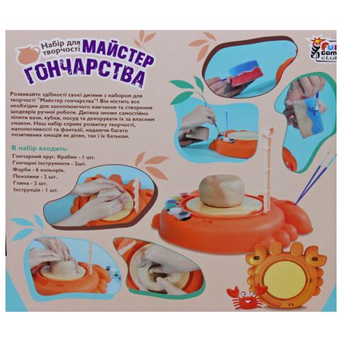 Комплектація: Гончарний круг, крабик, гончарні інструменти (2 шт), фарби (6 кольорів), пензлики (2 шт), глина (2 шт), інструкція