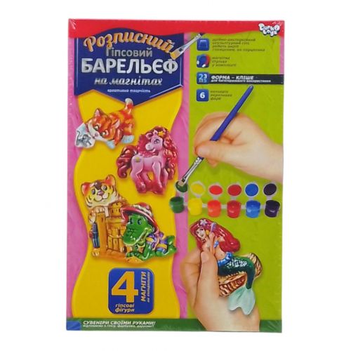 Набір для творчості “Писаний барельєф на магнітах”. Для початку, готуємо гіпсовий розчин, потім заливаємо його в формочки (4 фігури). Після того як розчин застигне, потрібно приклеїти магнітну стрічку на зворотному боці фігурки. Останній крок – розфарбовування фігурок (фарби і пензлик в комплекті).