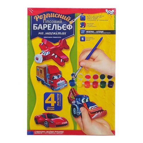 Набір для творчості “Писаний барельєф на магнітах”. Для початку, готуємо гіпсовий розчин, потім заливаємо його в формочки (4 фігури). Після того як розчин застигне, потрібно приклеїти магнітну стрічку на зворотному боці фігурки. Останній крок – розфарбовування фігурок (фарби і пензлик в комплекті).
