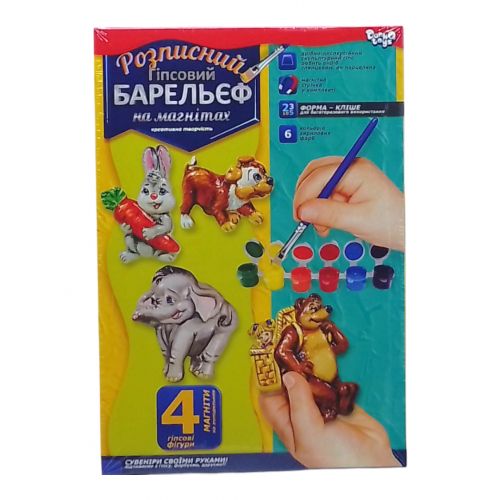 Набір для творчості “Писаний барельєф на магнітах”. Для початку, готуємо гіпсовий розчин, потім заливаємо його в формочки (4 фігури). Після того як розчин застигне, потрібно приклеїти магнітну стрічку на зворотному боці фігурки. Останній крок – розфарбовування фігурок (фарби і пензлик в комплекті).