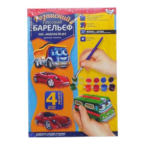 Набір для творчості “Писаний барельєф на магнітах”. Для початку, готуємо гіпсовий розчин, потім заливаємо його в формочки (4 фігури). Після того як розчин застигне, потрібно приклеїти магнітну стрічку на зворотному боці фігурки. Останній крок – розфарбовування фігурок (фарби і пензлик в комплекті).