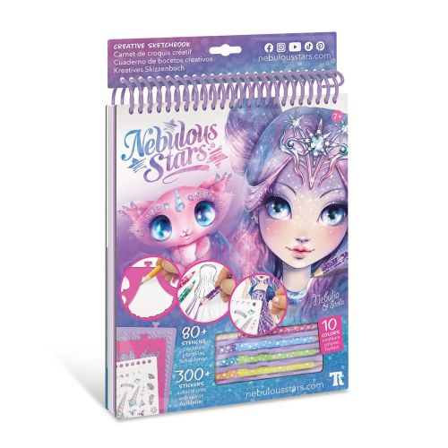 Комплектація: скетчбук, 2 аркуші з трафаретами на 80 графічних елементів, 5 кольорових олівців, 3 візерунки для створення відбитків технікою втирання, наліпки, 8 технік малювання, Буклет з історією Небулії, Теорія кольору, Інструкція.