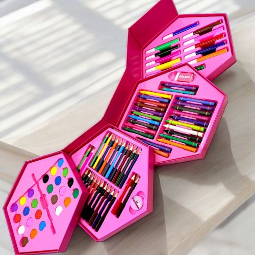 Набір для творчості та малювання – це ідеальне рішення для маленьких художників. У комплект входять кольорові олівці, фарби, фломастери, воскова крейда, точила, пензель і гумка — всього 112 елементів. Все необхідне для яскравих малюнків, розвитку фантазії та креативного дозвілля в одному зручному кейсі.