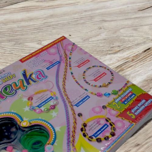 Комплектація: Різнокольорова нитка “джгут”, еластична нитка, різнокольорові намисто, полімерні кристали, різнокольоровий бісер, металевий замок – карабін, деревʼяні намисто, детальна покрокова інструкція
